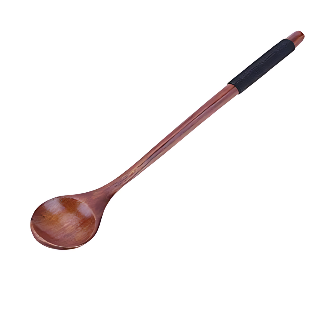 Sendok aduk yang dirancang dengan elegansi sederhana dan terbuat dari kayu alami berkualitas tinggi. Sendok aduk ini memiliki bentuk yang ramping dan tangkai yang nyaman digenggam, memudahkan penggunaan saat mencampur dan mengaduk berbagai hidangan. Bagian tangkai sendok aduk ini didekorasi dengan hiasan tali hitam yang melingkari dengan indah, menambahkan sentuhan estetika yang menarik. Tali hitam membentuk pola atau simpul tertentu, menciptakan kontras yang elegan dengan warna alami kayu. Hiasan tali hitam ini bukan hanya unsur dekoratif, tetapi juga memberikan kesan artistik pada sendok aduk, menjadikannya lebih dari sekadar alat dapur fungsional. Keindahan simpel dari kayu alami dan aksen tali hitam ini membuat sendok aduk ini cocok untuk berbagai jenis meja, dari yang formal hingga yang casual. Dengan desainnya yang cantik dan bahan alaminya, sendok aduk ini tidak hanya memberikan fungsi praktis saat memasak, tetapi juga memberikan sentuhan keindahan pada dapur atau ruang makan Anda.