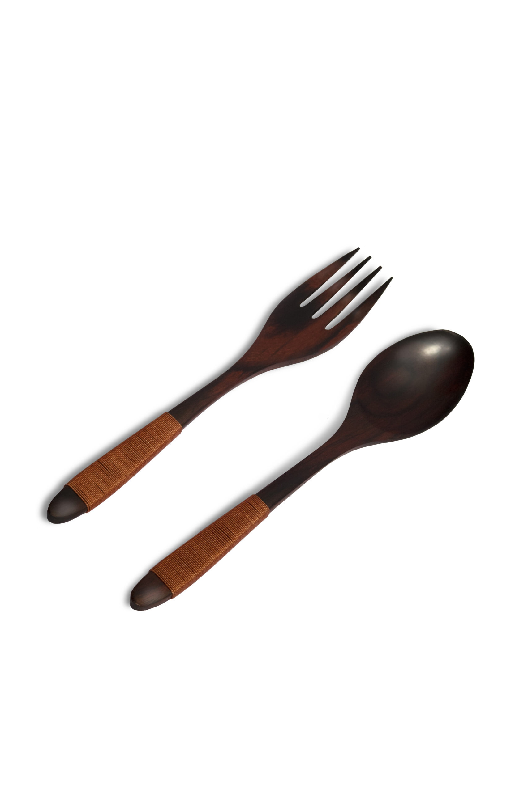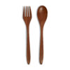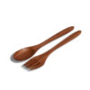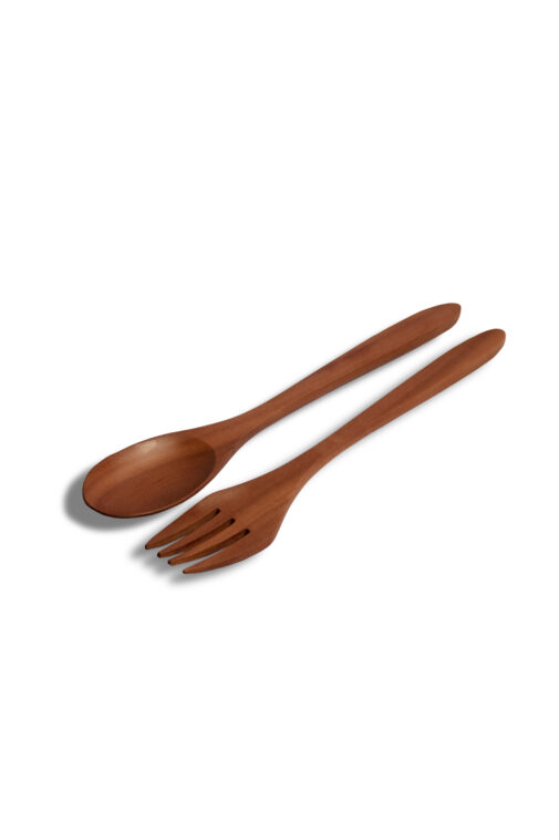 Sepasang sendok dan garpu yang terbuat dari kayu dengan desain yang simpel dan elegan. Peralatan makan ini memancarkan keindahan alami kayu dengan warna dan tekstur yang khas. Desain simpel pada sendok dan garpu ini mengutamakan kesederhanaan, dengan pegangan yang lurus dan kepala peralatan yang minimalis.
