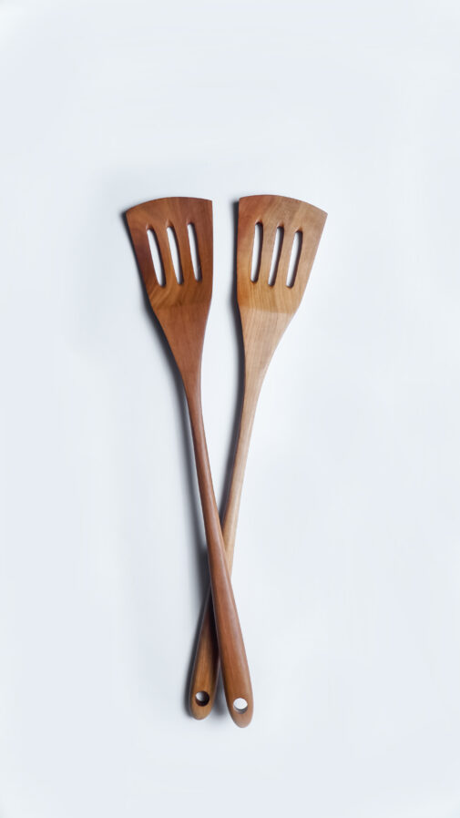 Bentuk spatula yang flat sangat nyaman digunakan untuk menumis ataupun memasak omellete pegangan berbahan kayu tidak menghantar panas, sehingga nyaman dalam genggaman.