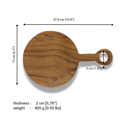 A perfect blend of style and function — this 17 cm round teak board with a total length of 27.5 cm is ideal for serving, slicing, or styling your table. The solid teak wood with natural grain brings warmth and elegance to your kitchen or café. Handy, timeless, and beautiful.
